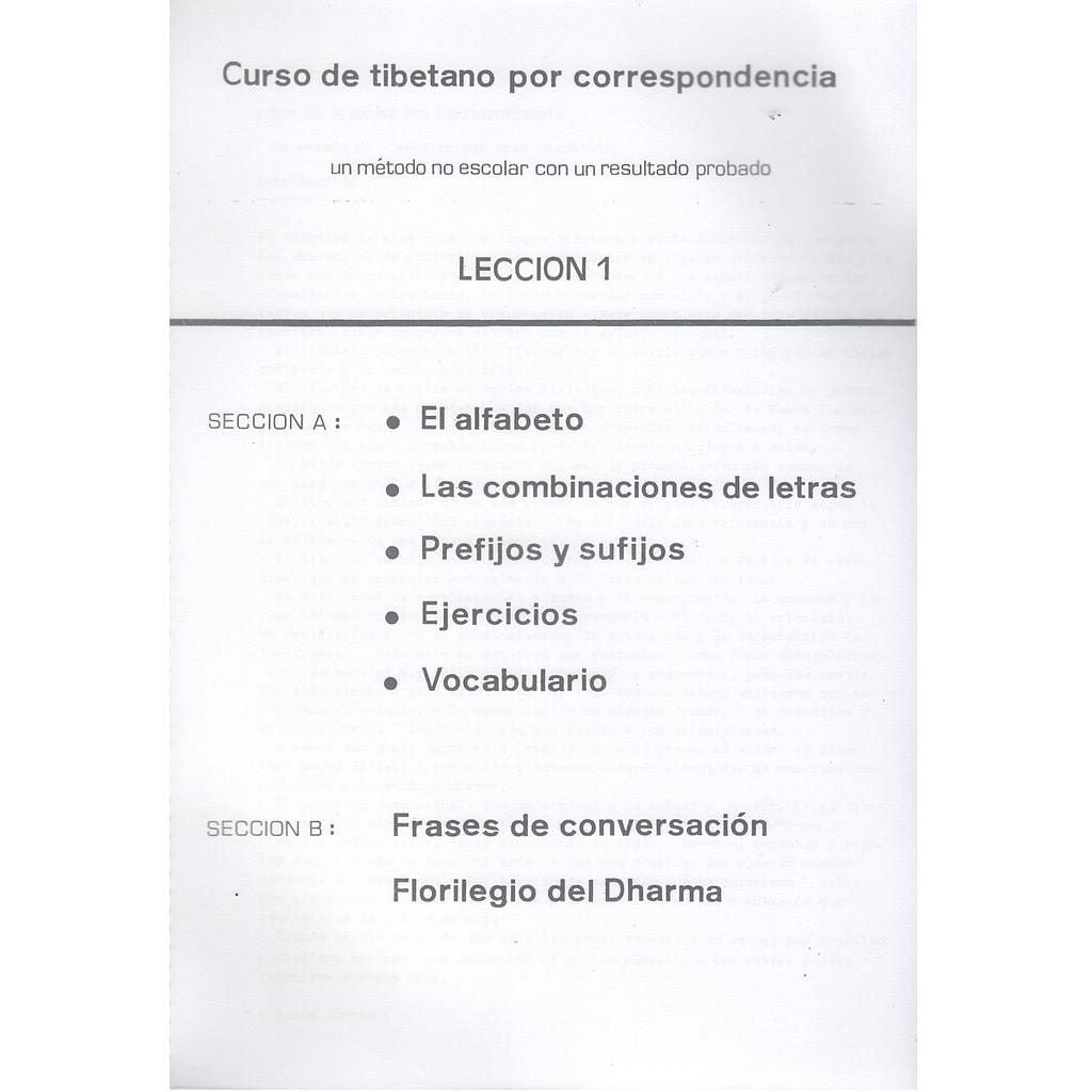 Primera lección del curso de tibetano. El curso incluye seis cuadernos en total, los cuales se solicitan por separado y un audio con la pronunciación de las diferentes lecciones. El audio se envía por correo electrónico con un enlace para descargar de dropbox.